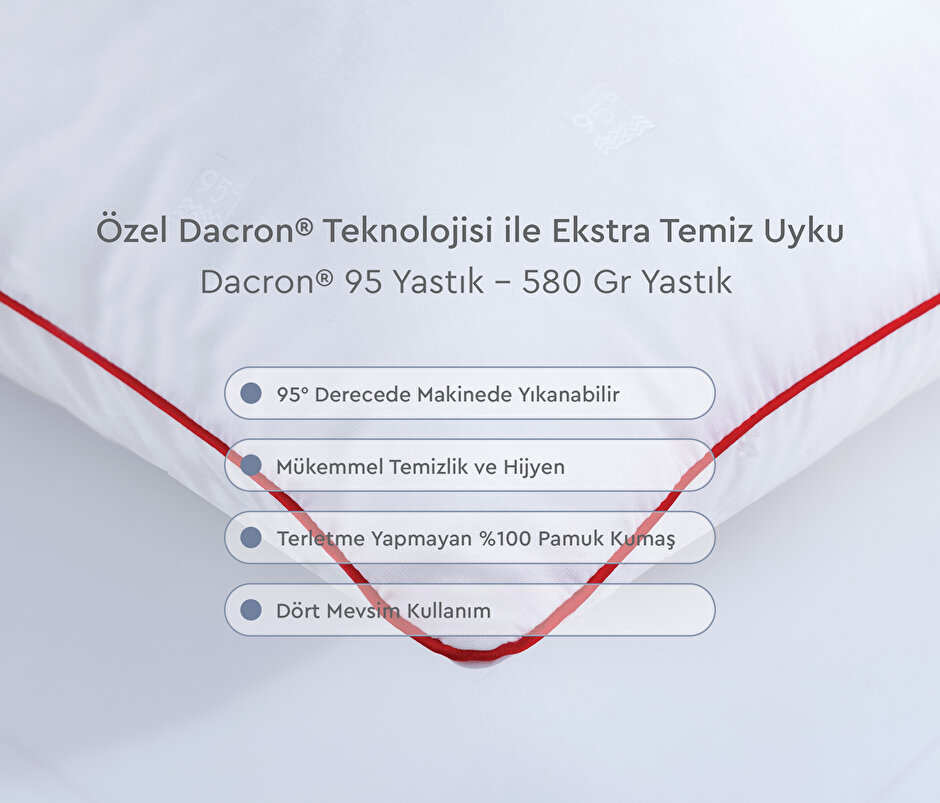 Dacron kumaşı ayrışmaya ve aşınmaya karşı dirençlidir. Yataş dacron yastık ürünleri %100 pamuk içerir ve daha az kırışır. Daha dayanıklı ve ısıyı tutan yastık kumaşı uyku kalitenizi arttırarak 4 mevsim kullanılabilir. Yüksek ısılarda yıkanabilir işte tam bu noktada da aradığınız hijyeni size sağlar. Gönül rahatlığıyla uykuya dalmanıza olanak tanır. Özel kumaşı ve elyafı sayesinde ekstra temizlik gerektiren hastane, otel gibi yerler için çok uygundur. Dacron ürünlerinde yıkanınca ağarma olmaz. Dacron yastık çeşitleri nefes alan özel dolgusu ve yüksek nem transferi sağlaması sayesinde terlemeyi minimuma indirir. Uyku esnasında aşırı terleyen bir yapıya sahip olsanız bile kuru ve konforlu bir şekilde uyanmanıza olanak tanır. Yataş dacron yastık size ideal uyku sıcaklığında bir ortam hazırlar. Böylelikle maksimum buharlaşma kapasitesiyle enerji tasarrufu sunar. Yastık, düşük sıcaklıklarda bile yıkandığında hijyen sağlar, verimli bir performans alınır. Mükemmel bir kumaşa sahip olan dacron yastık, yumuşacık dokusuyla geceleri uyurken teninizde narin bir dokunuş etkisi bırakır. Tertemiz bir uyku sunan bu yastık, boyun bölgenizle kusursuz bir uyum içerisindedir.
