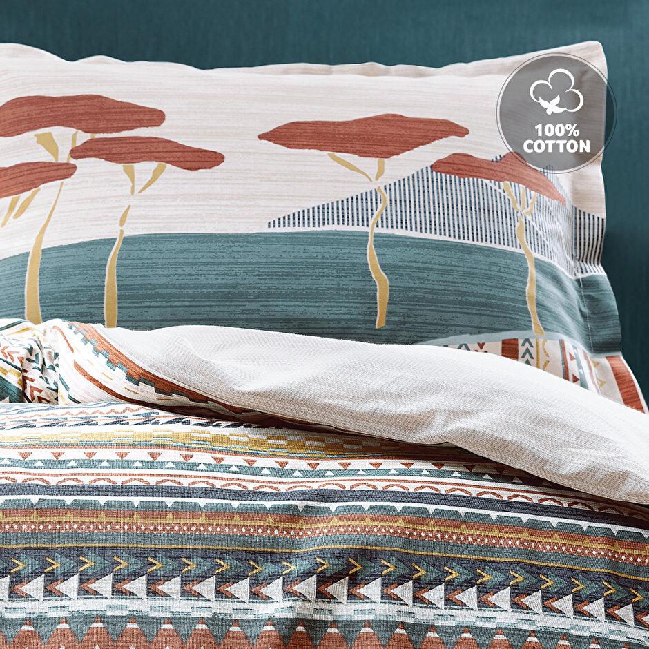 Lepal Beige Duvet Cover Set brings the calmness and bohemian spirit of nature to homes. The warmth of the earth tones, together with the gentle breeze at sunset, makes you feel peace. The minimalist tree silhouettes on the pillowcases make its design stand out, offering an idyllic landscape. Thanks to its double-sided use feature, it can create different design combinations. pillowcase with borders offer decorative elegance with edge details
