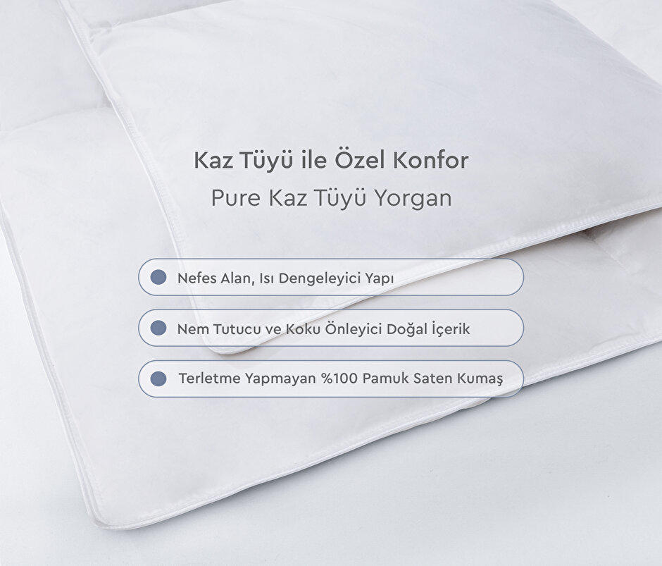 Yumuşacık Bir His ve İdeal Sıcaklık İçin Kaz Tüyü YorganEstetik görünümüyle nevresiminize dolgun görünüm kazandıran kaz tüyü yorgan hafif bir yapıya sahiptir. Bu özelliğiyle uyku anında size hareket özgürlüğü tanır. İçeriğindeki gıdık ve sırt tüyleri sayesinde yumuşaklık ve yaylanma özelliği kazanır ki bu, yumuşacık bir hisle uyumak isteyenler için vazgeçilmezdir. Uyku esnasında konforu üst seviyeye çıkarmak isteyenler için Yataş Bedding'in özel olarak tasarladığı kuş tüyü yorgan modelleri, tek ve çift kişilik seçenekleri ve farklı ebatlarıyla tüm ihtiyaçlarınıza yanıt verir.
